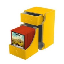 El modelo convertible Watchtower 100+ combina caja para mazos, cajón para accesorios y bandeja para cartas en un elegante producto. La bandeja para cartas puede contener hasta 100 cartas con doble funda y las protege con un suave forro interior de microfibra. El cajón para accesorios es perfecto para guardar dados, fichas y otros artículos pequeños.