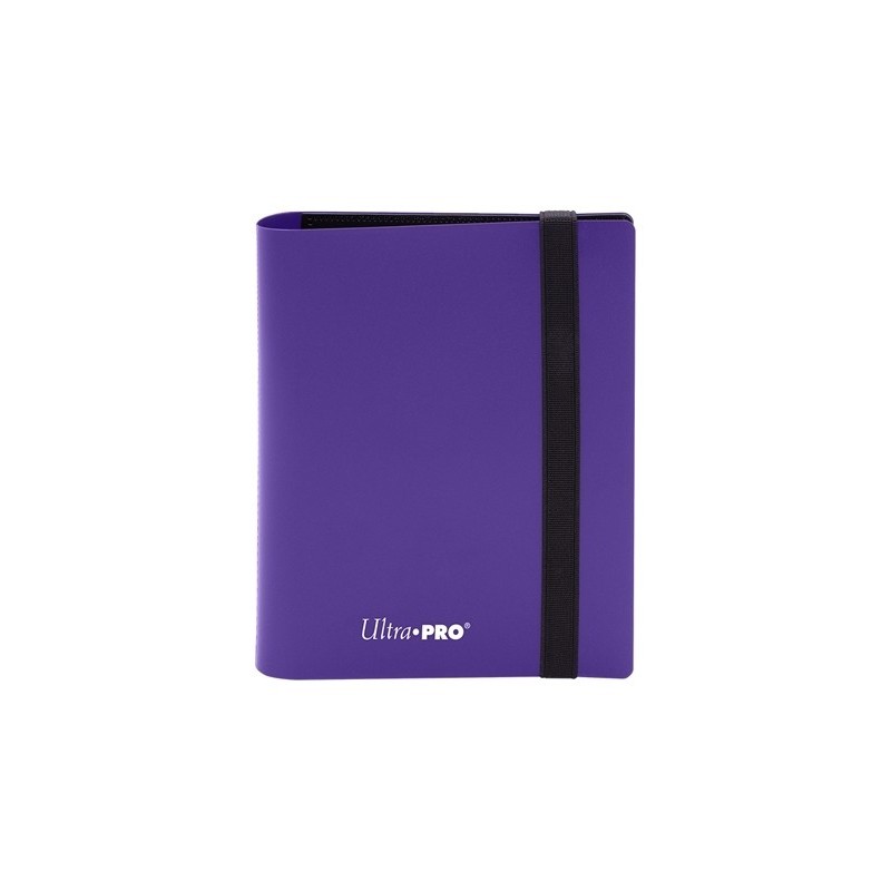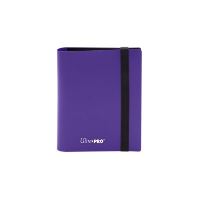 Carpeta 2 bolsillos PRO-Binder Eclipse morado Ultra Pro. Capacidad para guardar hasta 80 cartas enfundadas, a razón de 2 bolsillos por cada una de las 20 páginas que tiene la carpeta. Aspecto y tacto de cuero. Tira elástica para mantener la Pro Binder cerrada.