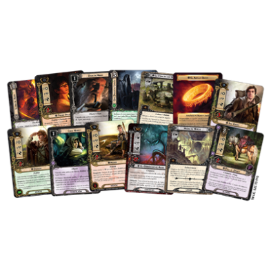 1 reglamento y 329 cartas: 7 cartas de Héroe, 57 cartas de Jugador, 22 cartas de Misión, 209 cartas de Encuentro, 6 cartas de Campaña, 28 cartas de ayuda/carga