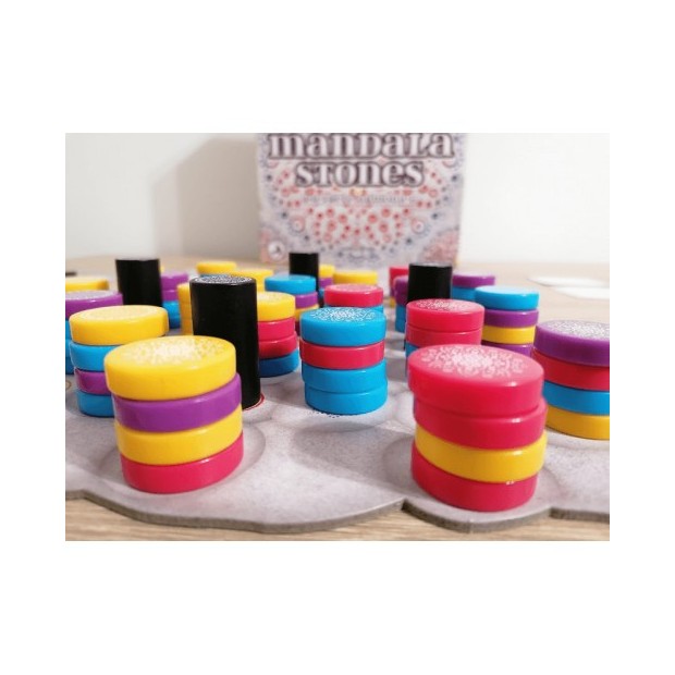 Deberemos colocar nuestras piedras (fichas) de la forma más astuta que se nos ocurra utilizando nuestra estrategia para superar a los demás jugadores, ya que, aunque entre todos crearemos un precioso mandala de piedras en este juego de mesa solo uno será el vencedor final.