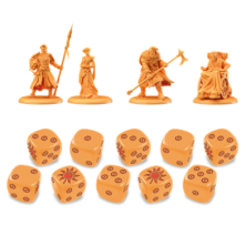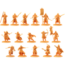 1 Libro de reglas 4 cartas de unidad Combatiente, 7 cartas de Vínculo, 3 cartas de unidad No Combatiente, 26 cartas de Tácticas, 3 cartas de reglas especiales, 12 cartas de Asedio, 24 cartas de Misión, 10 cartas de Objetivo, 1 carta de referencia, 1 carta de muros de castillo, 1 regla de alcance, 71 fichas de cartón, 1 tablero de Tácticas, 10 dados D6 de los Martell, 1 dado D3 de seis caras blanco, 4 bandejas de movimiento, 55 miniaturas, 10 elementos de terreno, 3 muros de castillo