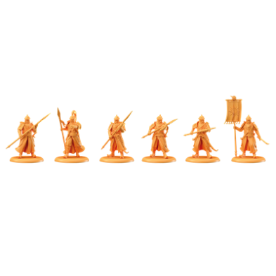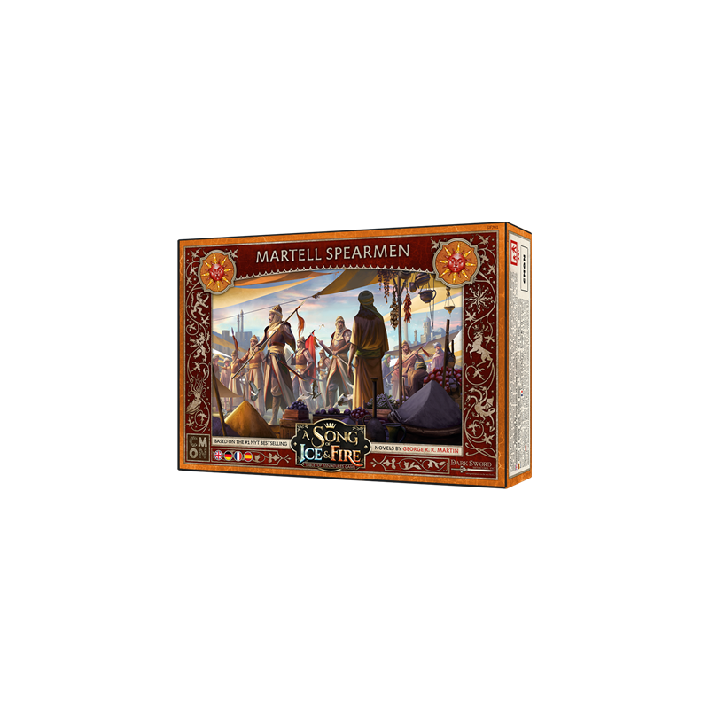 13 miniaturas: 1 Capitán de los Lanceros, 1 Abanderado de los Lanceros Martell, 11 Lanceros Martell. 2 cartas: 1 carta de unidad Combatiente, 1 carta de Vínculo, 1 bandeja de movimiento.