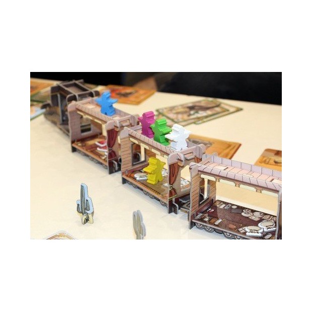Una vez lo terminemos tendremos un tablero con forma de tren con 2 direcciones en las que moverse. Cada jugador, podrá mover su Meeple de madera hacia adelante o hacia detrás o bien subir y bajar (desde el techo al interior del tren).