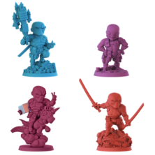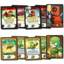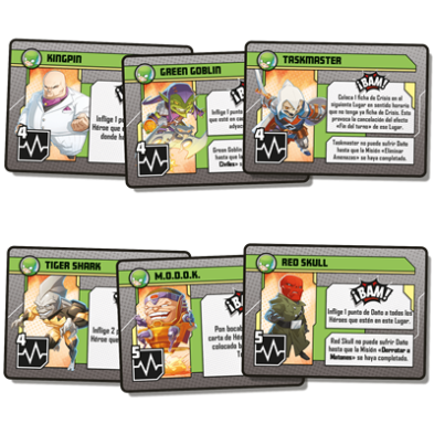 1 miniatura de Héroe, 1 miniatura de Antihéroe, 1 miniatura de Villano, 1 miniatura de Desafío, 1 Lugar, 24 cartas de Héroe, 2 tableros de Villano, 24 cartas de Plan maestro, 12 cartas de Amenaza, 25 cartas de Desafío, 1 hoja de reglas