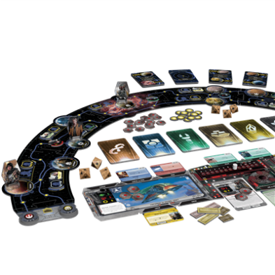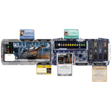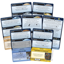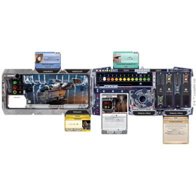12 Hojas de nave, 4 Tableros de Jugadores, 4 Marcadores de Fama de Plástico, 16 Fichas de Reputación, 22 Fichas de Contacto, 16 Fichas de Patrulla, 8 Personajes de cartón con sus peanas, 40 Fichas de Daños, 60 Fichas de Crédito, 70 Cartas de Encuentro, 70 Cartas de Mercado, 53 Cartas del Banco de Datos, 8 Cartas de Personaje, 4 Cartas de Referencia, 10 Cartas de IA, 12 Fichas de Objetivos, 6 Fichas de Mapa, 2 Finales de Mapa, 6 Dados, 1 Aprenda a Jugar, 1 Referencia de Reglas.