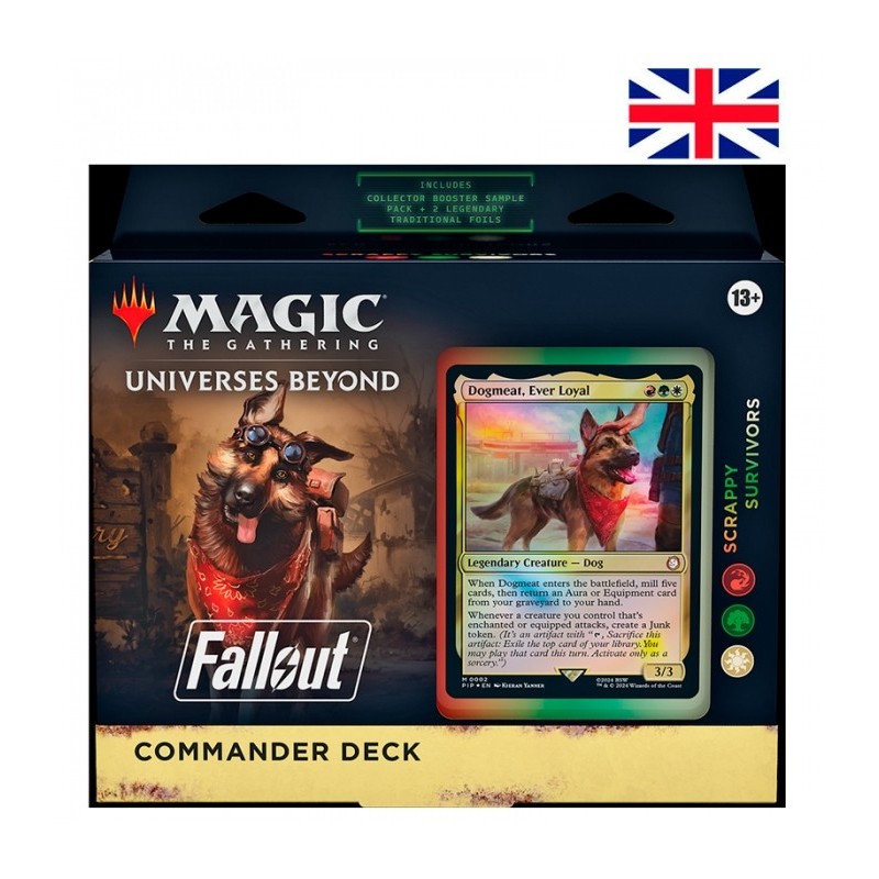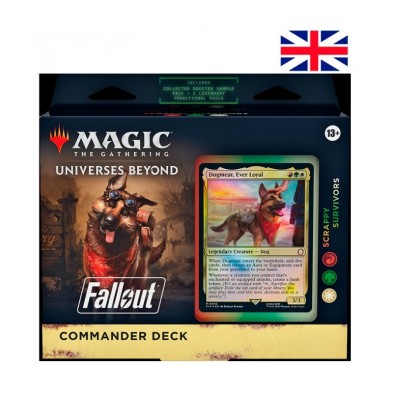 Commander Display 4 Decks Fallout Inglés - Magic The Gathering Ideal para sesiones epicas para varios jugadores. Cada mazo contiene 100 cartas entre las que se encuentran: - 10 cartas raras y miticas nuevas por mazo como minimo. - 1 sobre de coleccionista con 2 cartas de muestra. - 2 cartas foil tradicionales - 1 carta comandante foil con grabado especial.