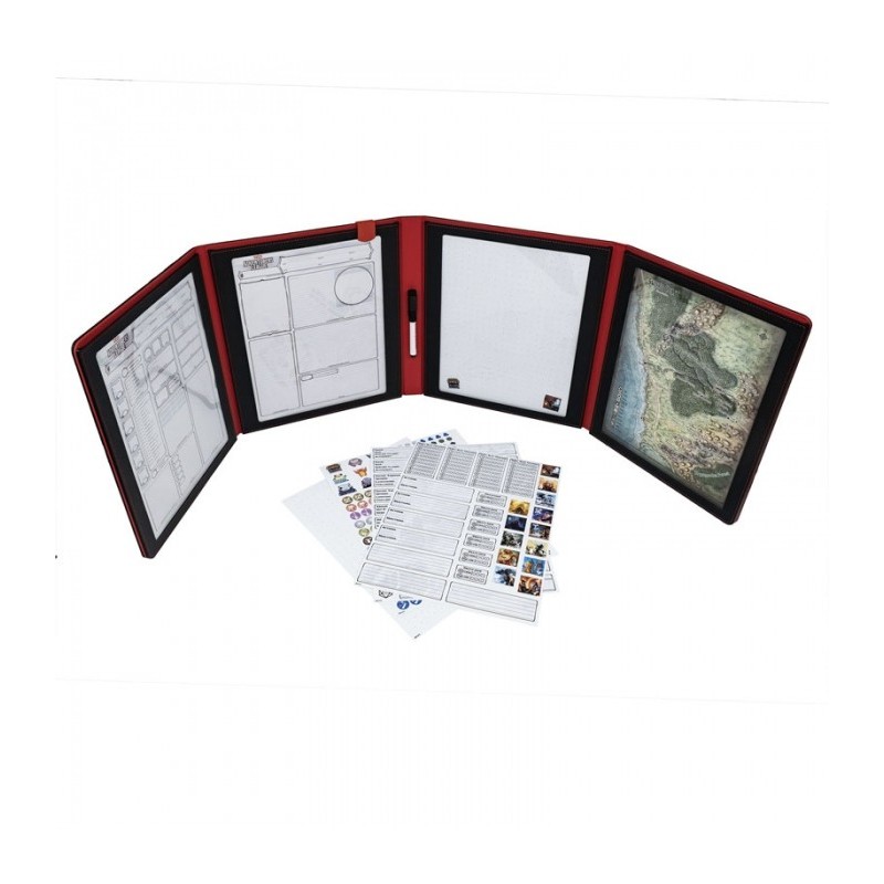 Pantalla Premium de cuero sintetico plegable que ofrece todo lo que necesitas para dirigir tu campaña, y brinda la protección perfecta para ocultar las tiradas de dados. Cada uno de los cuatro bolsillos claros y escribibles en el interior de la pantalla puede contener hasta 10 hojas de papel, que también se pueden colocar fuera de los bolsillos con los 8 clips de seguimiento de iniciativa incluidos. Abierto por completo tiene unas medidas aproximadas de 108 cm de largo y 31 de alto.